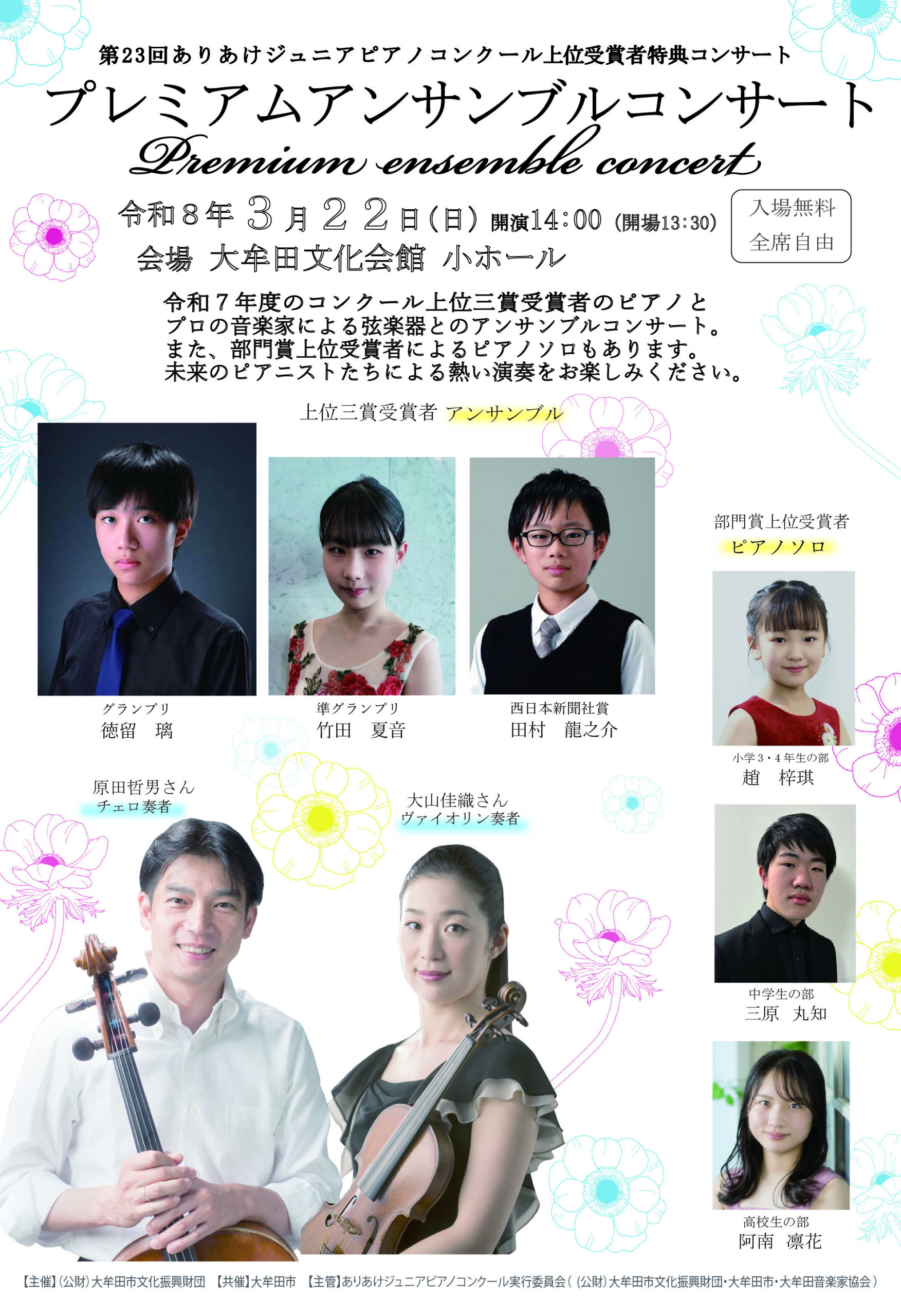 上位三賞を受賞した3名とプロの音楽家が共演する「プレミアムアンサンブルコンサート」を開催します。