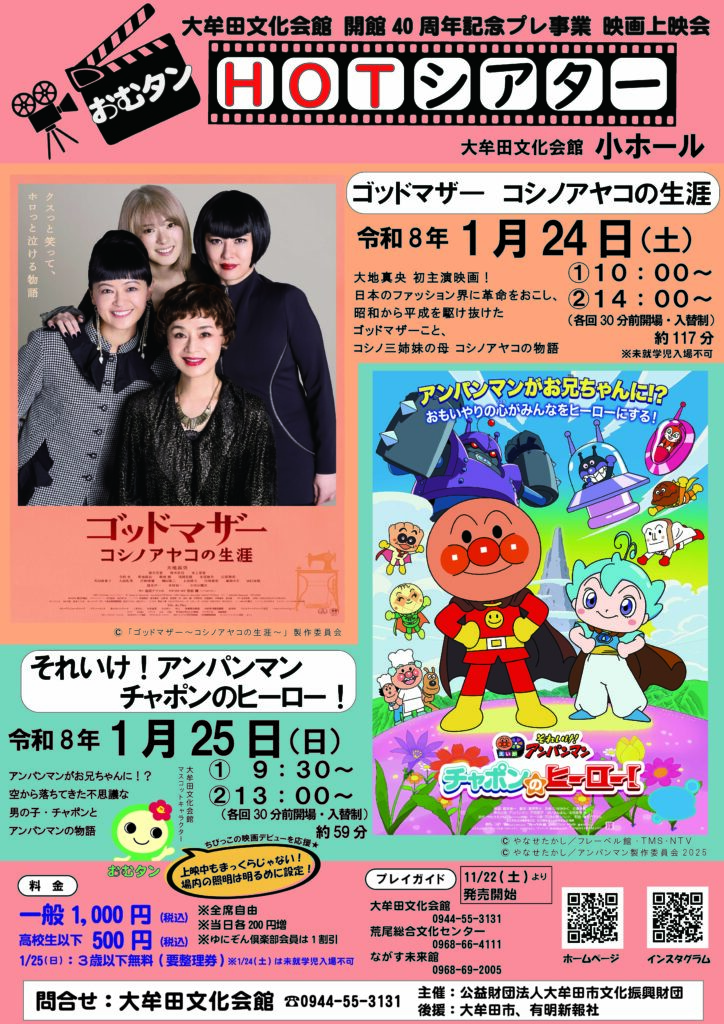 令和8年1月24日(土) ゴッドマザー コシノアヤコの生涯 令和8年1月25日(日) それいけ!アンパンマン チャポンのヒーロー! |